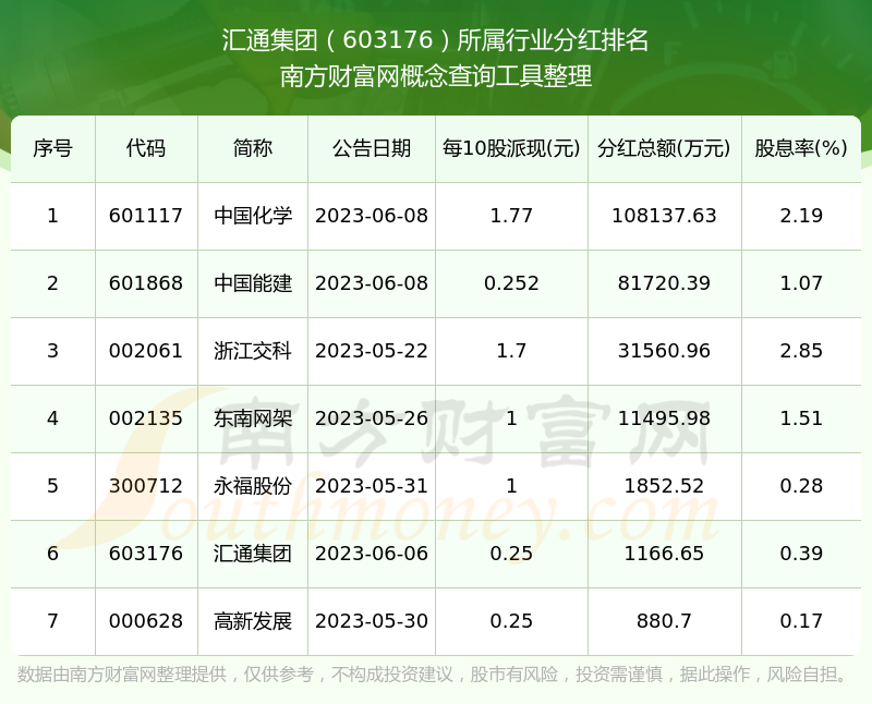 按照南方财富网趋势选股系统统计,汇通集团所属行业为工程建设行业,工程建设行业分红排名情况如下表: