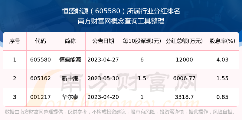 按照南方财富网趋势选股系统统计,恒盛能源所属行业为蒸汽行业,蒸汽行业分红排名情况如下表: