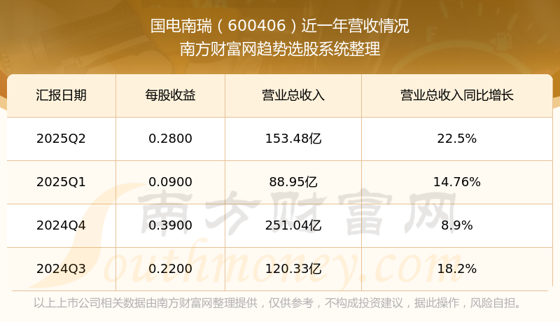 国电南瑞2025年第二季度财报显示,公司主营收入153.48亿元,同比22.5%;归母净利润22.72亿元,同比7.33%;扣非净利润21.95亿元,同比5.84%;