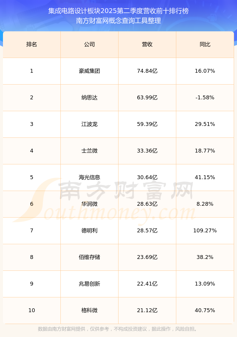 按照南方财富网概念查询工具统计,该股所属板块为集成电路设计板块,该板块共有88只股票,芯原股份2025第二季度营收在该板块中排名为第35名,该板块2025第二季度营收排名前十的股票如下表: