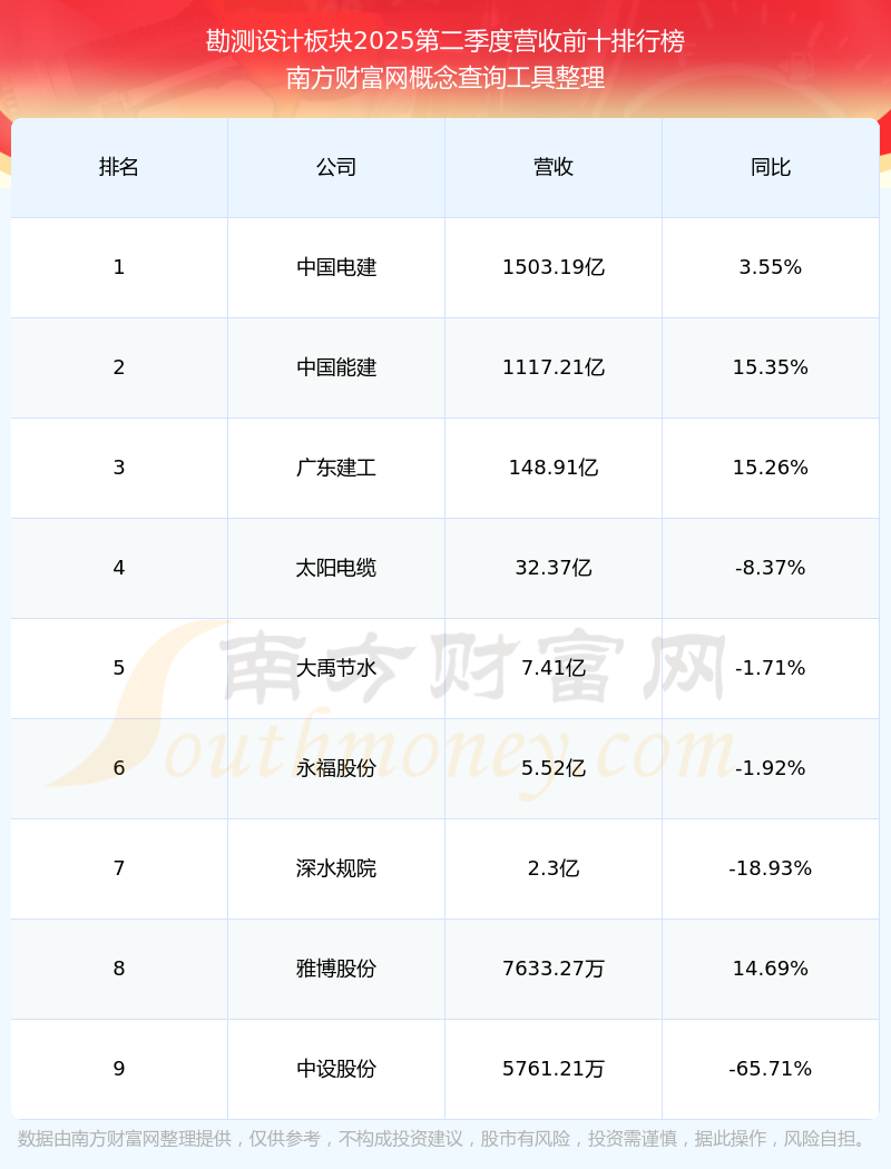 按照南方财富网概念查询工具统计,该股所属板块为勘测设计板块,该板块共有9只股票,中国电建2025第二季度营收在该板块中排名为第1名,该板块2025第二季度营收排名前十的股票如下表: