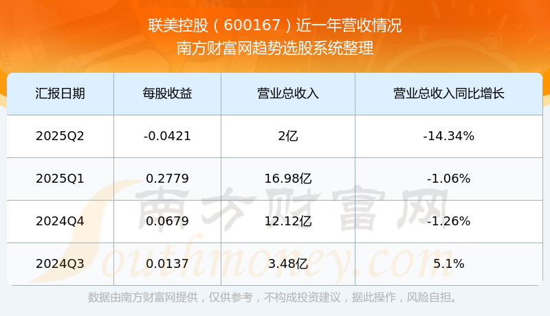 联美控股2025年第二季度显示,公司主营收入2亿元,同比-14.34%;归母净利润-9349.22万元,同比-7.81%;扣非净利润-1亿元,同比-23.97%;