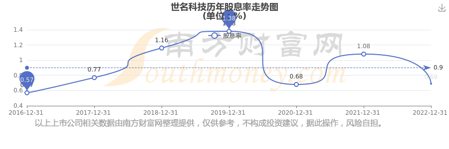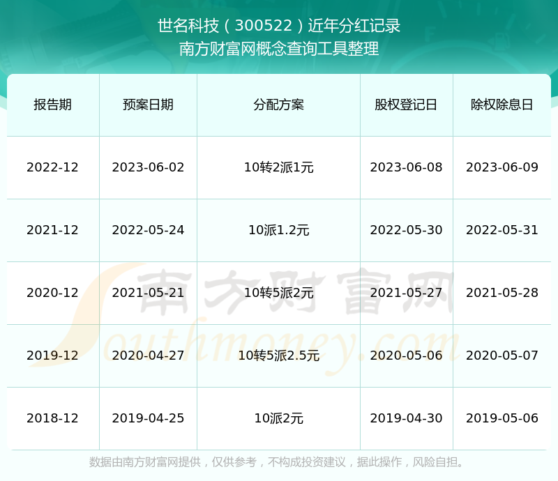 世名科技最新一次公布的分红方案为10转2派1元。本次权益分派股权登记日为2023年6月8日,除权除息日为2023年6月9日,派息日为2023年6月9日。