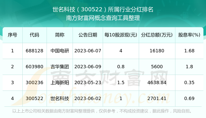 按照南方财富网趋势选股系统统计,世名科技所属行业为涂料行业,涂料行业分红排名情况如下表:
