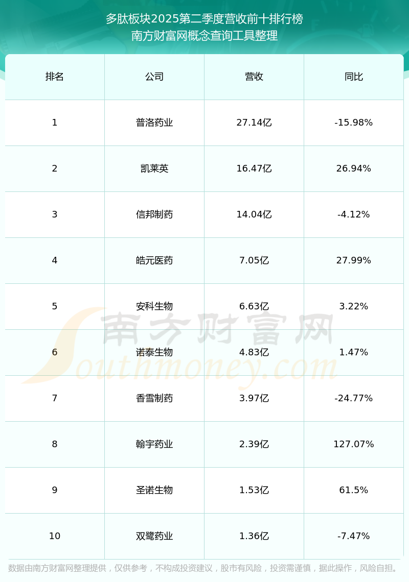 按照南方财富网概念查询工具统计,该股所属板块为多肽板块,该板块共有15只股票,博瑞医药2025第二季度营收在该板块中排名为第15名,该板块2025第二季度营收排名前十的股票如下表: