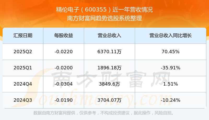 精伦电子2025年第二季度财报显示,公司主营收入6370.11万元,同比70.45%;归母净利润-1066.09万元,同比2.11%;扣非净利润-1070.14万元,同比2.67%。