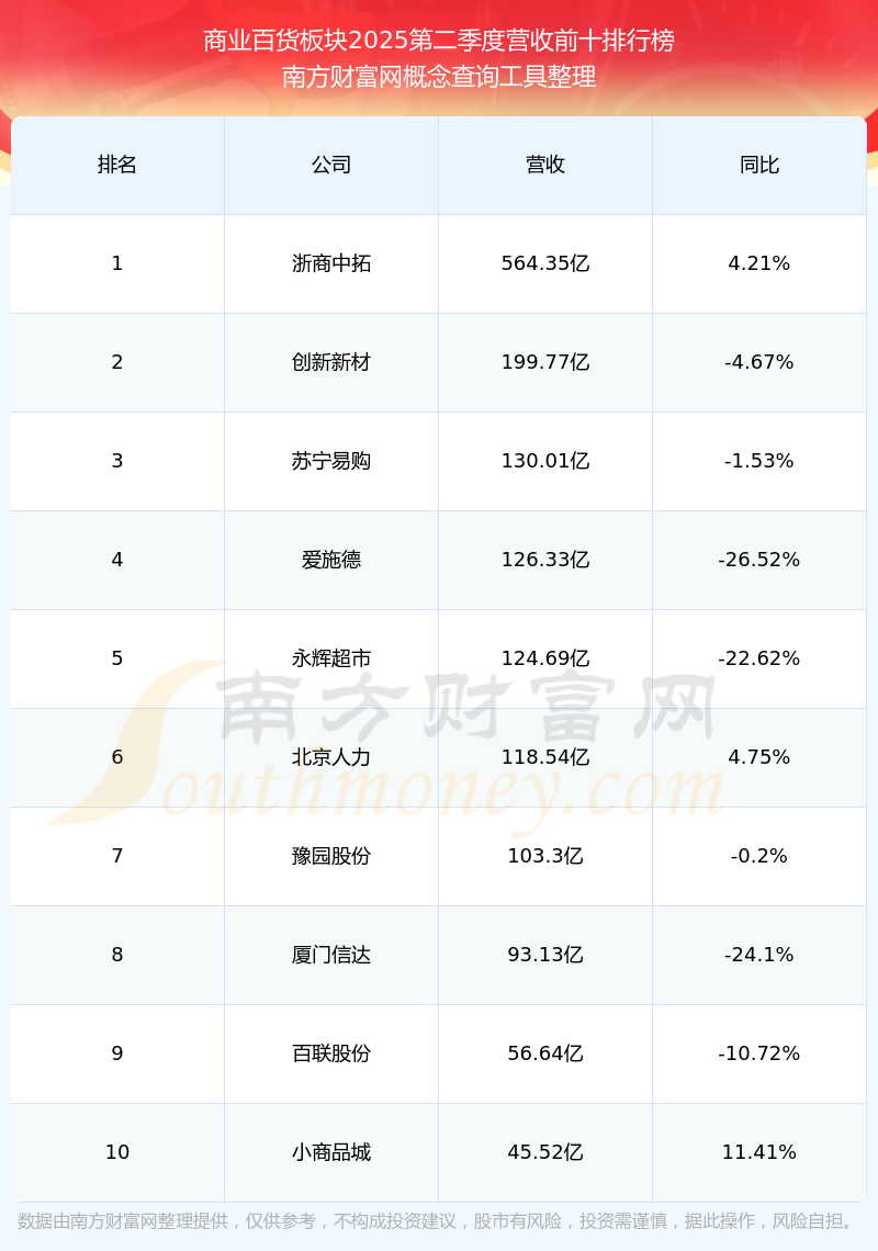 按照南方财富网概念查询工具统计,该股所属板块为商业百货板块,该板块共有75只股票,轻纺城2025第二季度营收在该板块中排名为第54名,该板块2025第二季度营收排名前十的股票如下表: