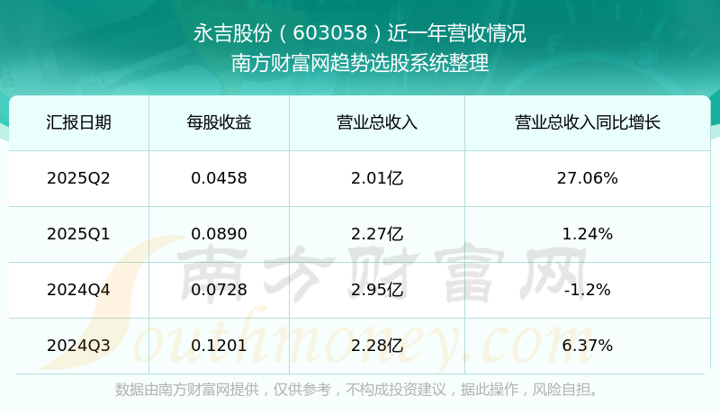 永吉股份(603058)披露2025年第二季度报告,报告期实现营收2.01亿元,同比27.06%;归母净利润1918.27万元,同比-49.2%;扣非净利润928.28万元,同比-73.9%;基本每股收益0.05元。