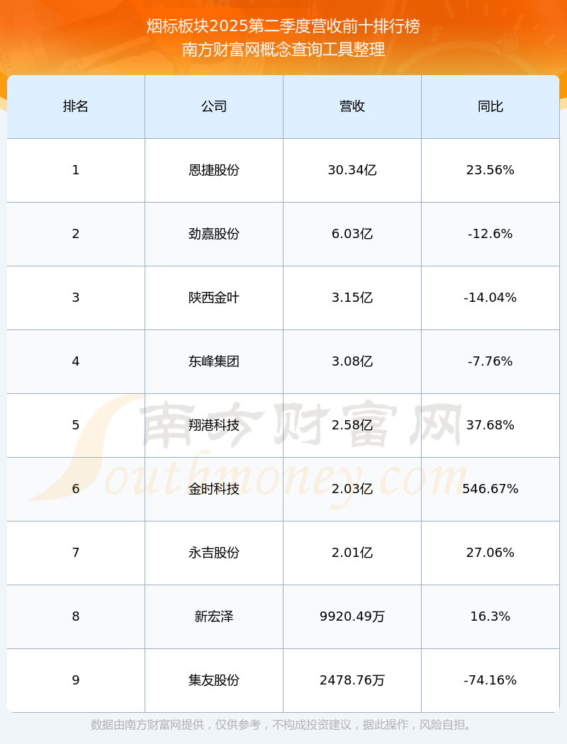 按照南方财富网概念查询工具统计,该股所属板块为烟标板块,该板块共有9只股票,永吉股份2025第二季度营收在该板块中排名为第7名,该板块2025第二季度营收排名前十的股票如下表: