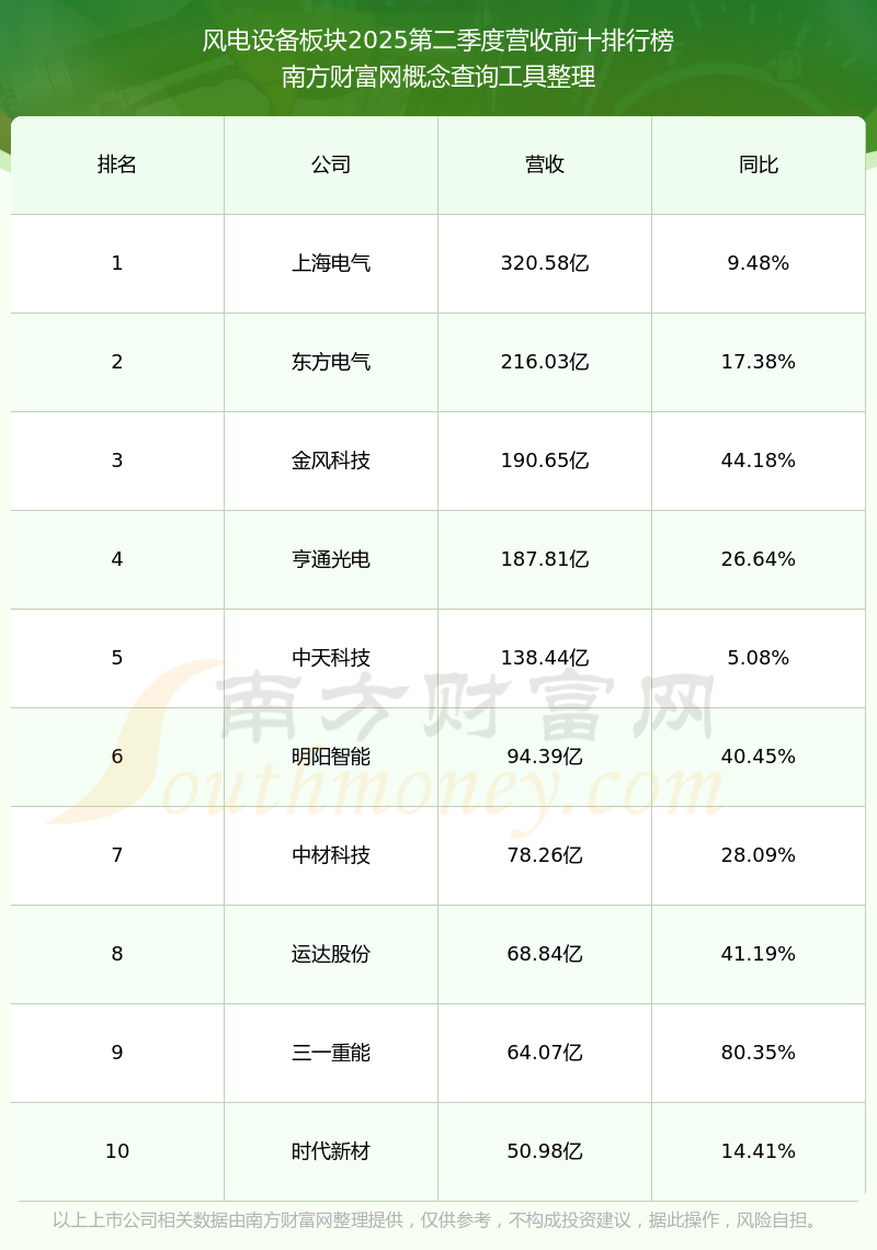 按照南方财富网概念查询工具统计,该股所属板块为风电设备板块,该板块共有50只股票,禾望电气2025第二季度营收在该板块中排名为第24名,该板块2025第二季度营收排名前十的股票如下表: