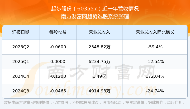 起步股份2025年第二季度显示,公司主营收入2348.82万元,同比-59.4%;归母净利润-3515.71万元,同比-28.91%;扣非净利润-5861.13万元,同比-112.1%;