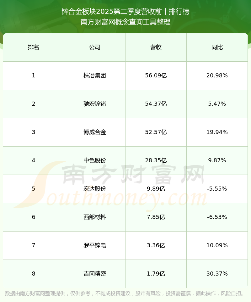 按照南方财富网概念查询工具统计,该股所属板块为锌合金板块,该板块共有8只股票,株冶集团2025第二季度营收在该板块中排名为第1名,该板块2025第二季度营收排名前十的股票如下表: