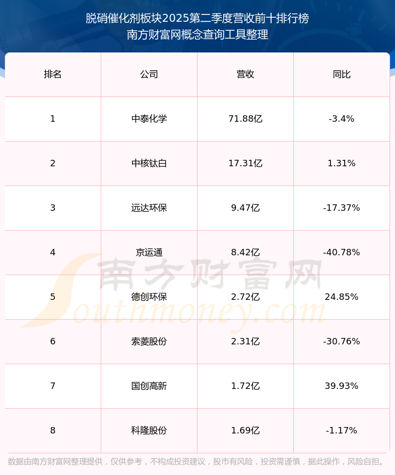 按照南方财富网概念查询工具统计,该股所属板块为脱硝催化剂板块,该板块共有8只股票,元琛科技2025第二季度营收在该板块中排名为第8名,该板块2025第二季度营收排名前十的股票如下表: