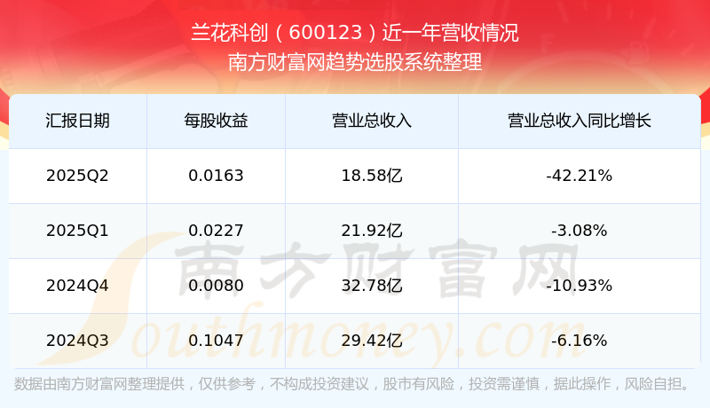 兰花科创2025年第二季度显示,公司主营收入18.58亿元,同比-42.21%;归母净利润2410.47万元,同比-94.22%;扣非净利润-2.03亿元,同比-148.32%。
