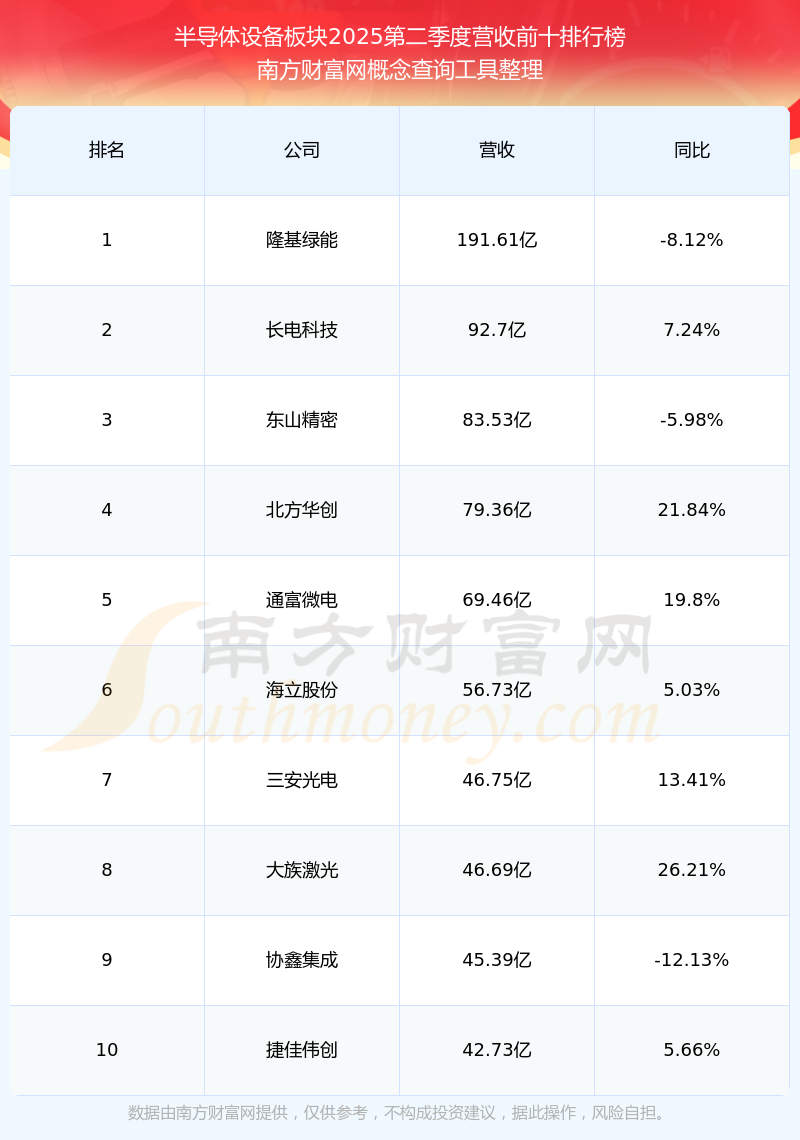 按照南方财富网概念查询工具统计,该股所属板块为半导体设备板块,该板块共有169只股票,芯源微2025第二季度营收在该板块中排名为第86名,该板块2025第二季度营收排名前十的股票如下表: