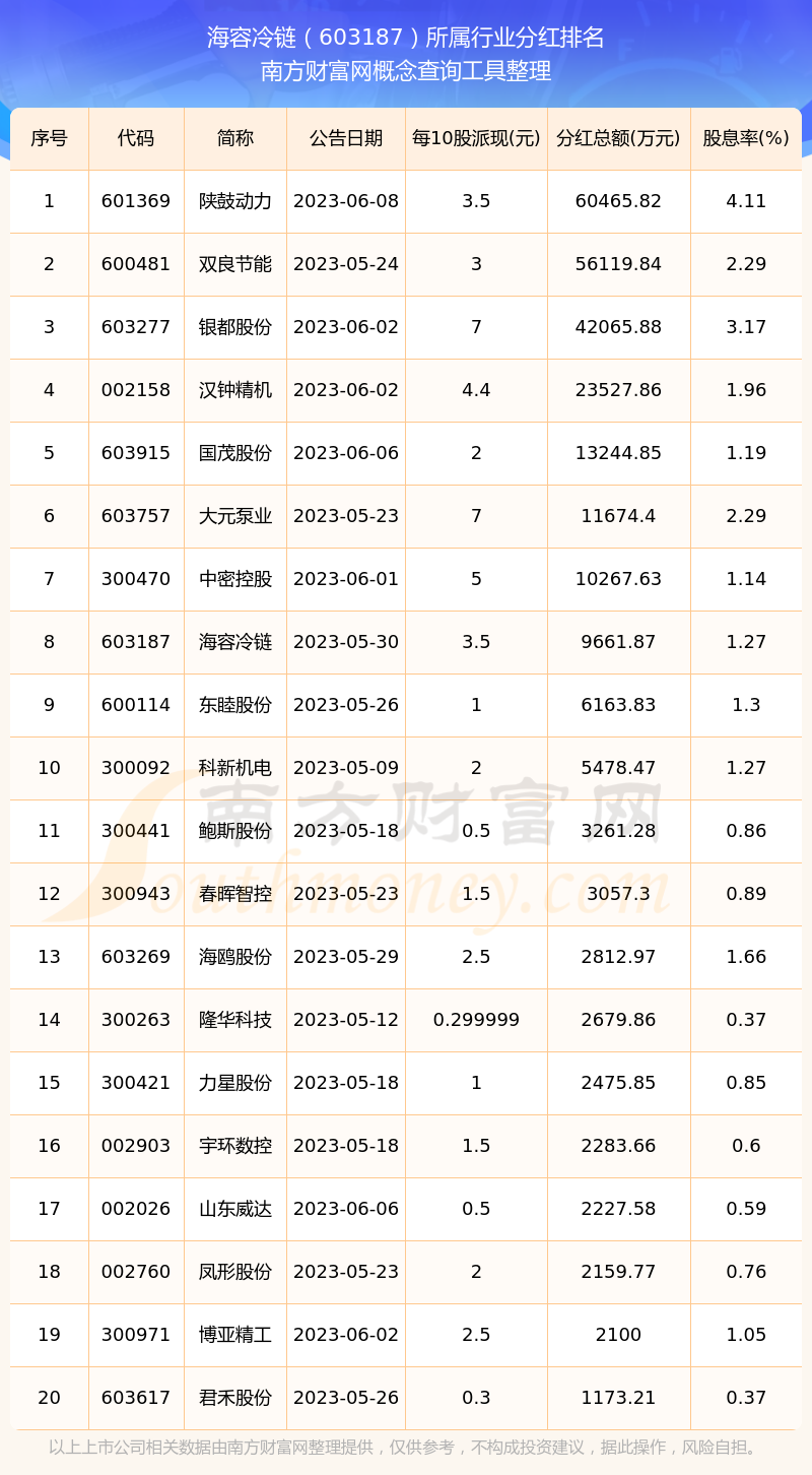 按照南方财富网趋势选股系统统计,海容冷链所属行业为冷链物流行业,冷链物流行业分红排名情况如下表: