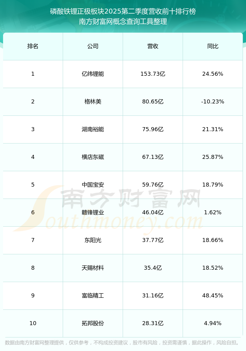 按照南方财富网概念查询工具统计,该股所属板块为磷酸铁锂正极板块,该板块共有27只股票,龙蟠科技2025第二季度营收在该板块中排名为第13名,该板块2025第二季度营收排名前十的股票如下表: