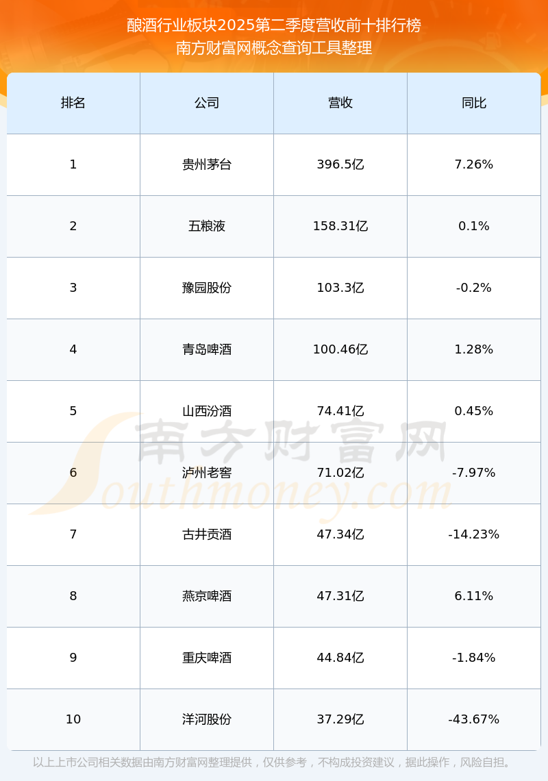 按照南方财富网概念查询工具统计,该股所属板块为酿酒行业板块,该板块共有42只股票,山西汾酒2025第二季度营收在该板块中排名为第5名,该板块2025第二季度营收排名前十的股票如下表: