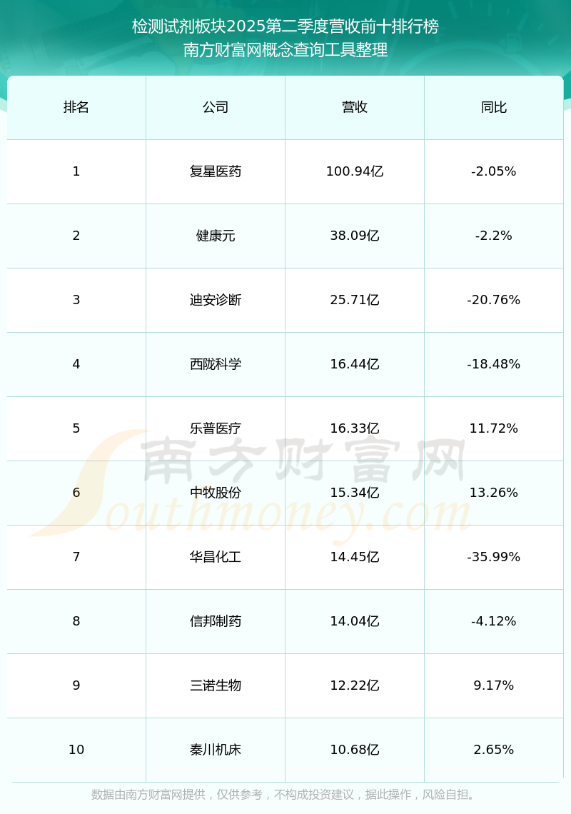 按照南方财富网概念查询工具统计,该股所属板块为检测试剂板块,该板块共有46只股票,硕世生物2025第二季度营收在该板块中排名为第41名,该板块2025第二季度营收排名前十的股票如下表: