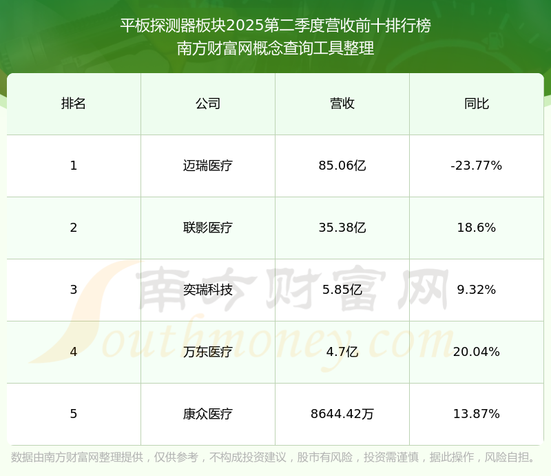 按照南方财富网概念查询工具统计,该股所属板块为平板探测器板块,该板块共有5只股票,奕瑞科技2025第二季度营收在该板块中排名为第3名,该板块2025第二季度营收排名前十的股票如下表: