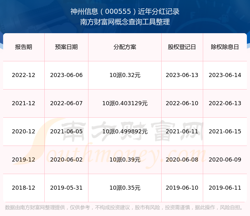神州信息最新一次公布的分红方案为10派0.32元。本次权益分派股权登记日为2023年6月13日,除权除息日为2023年6月14日,派息日为2023年6月14日。