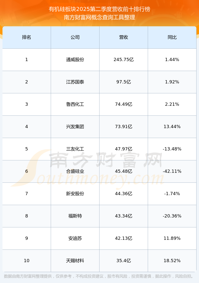 按照南方财富网概念查询工具统计,该股所属板块为有机硅板块,该板块共有48只股票,三孚股份2025第二季度营收在该板块中排名为第21名,该板块2025第二季度营收排名前十的股票如下表: