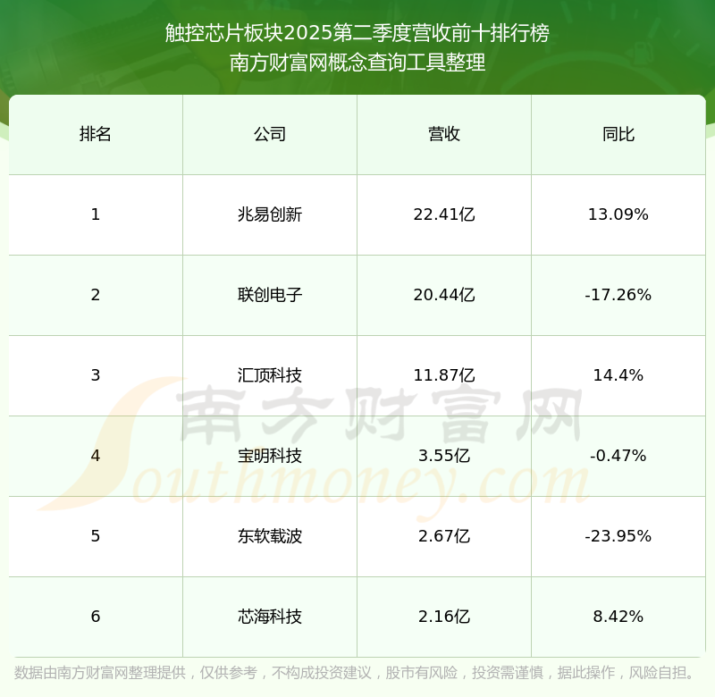 按照南方财富网概念查询工具统计,该股所属板块为触控芯片板块,该板块共有6只股票,汇顶科技2025第二季度营收在该板块中排名为第3名,该板块2025第二季度营收排名前十的股票如下表: