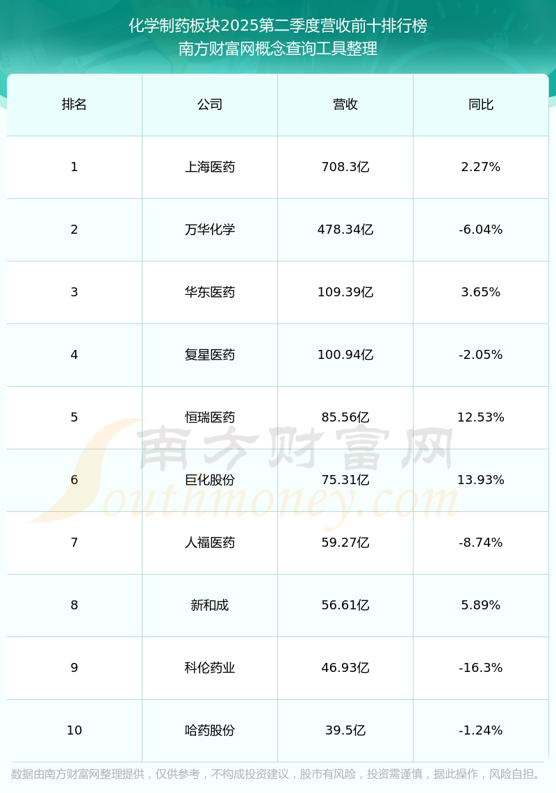 按照南方财富网概念查询工具统计,该股所属板块为化学制药板块,该板块共有183只股票,小方制药2025第二季度营收在该板块中排名为第143名,该板块2025第二季度营收排名前十的股票如下表: