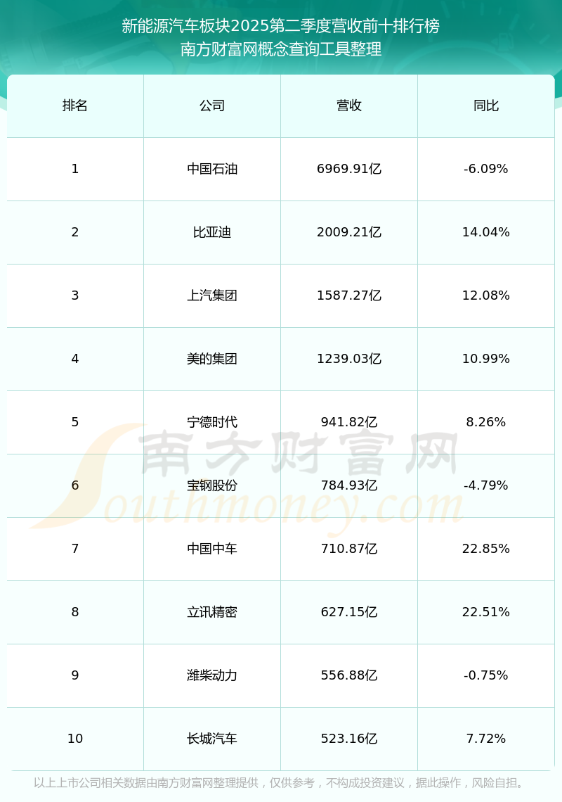 按照南方财富网概念查询工具统计,该股所属板块为新能源汽车板块,该板块共有958只股票,先惠技术2025第二季度营收在该板块中排名为第459名,该板块2025第二季度营收排名前十的股票如下表: