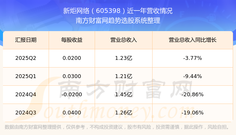 新炬网络发布2025年第二季度财报。实现总营收1.23亿元,同比增长-3.77%;扣非净利润同比增长-87.51%至95.88万元。
