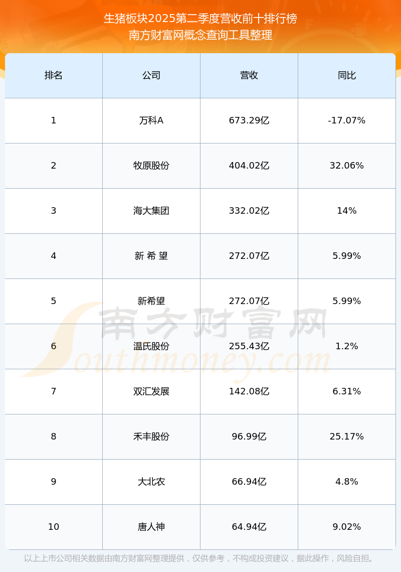 按照南方财富网概念查询工具统计,该股所属板块为生猪板块,该板块共有48只股票,新五丰2025第二季度营收在该板块中排名为第21名,该板块2025第二季度营收排名前十的股票如下表: