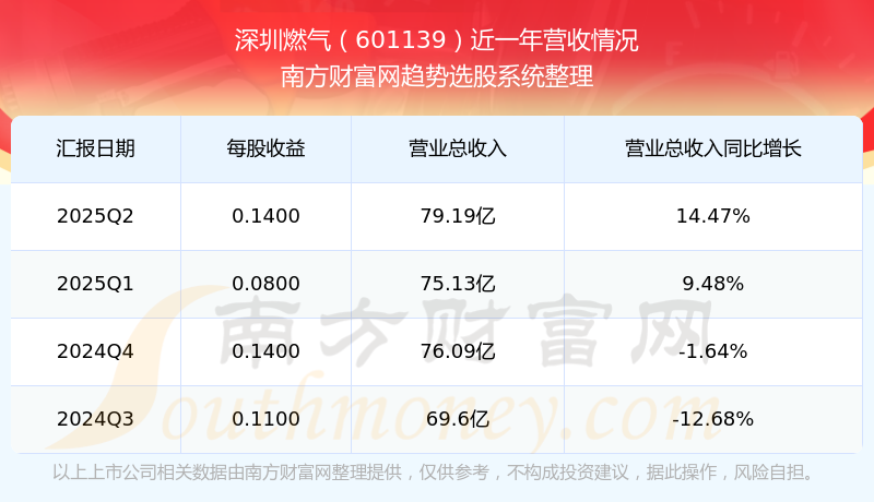 在2025年第二季度,深圳燃气的业绩表现,主营业务收入达到79.19亿元,实现了14.47%的同比增长率。同时,公司归母净利润录得4.05亿元,同比增长-12.5%。