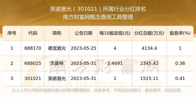 按照南方财富网趋势选股系统统计,英诺激光所属行业为激光器行业,激光器行业分红排名情况如下表: