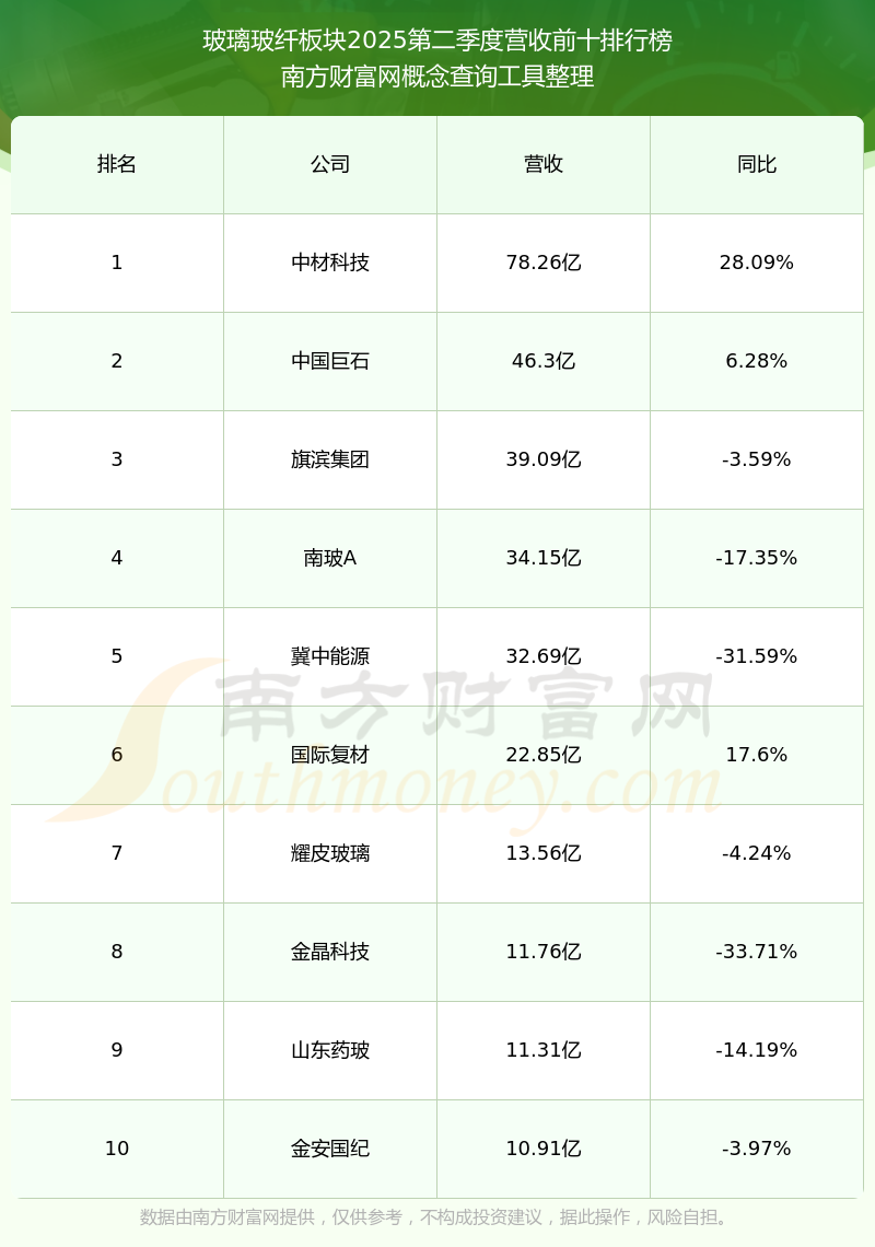 按照南方财富网概念查询工具统计,该股所属板块为玻璃玻纤板块,该板块共有23只股票,中国巨石2025第二季度营收在该板块中排名为第2名,该板块2025第二季度营收排名前十的股票如下表: