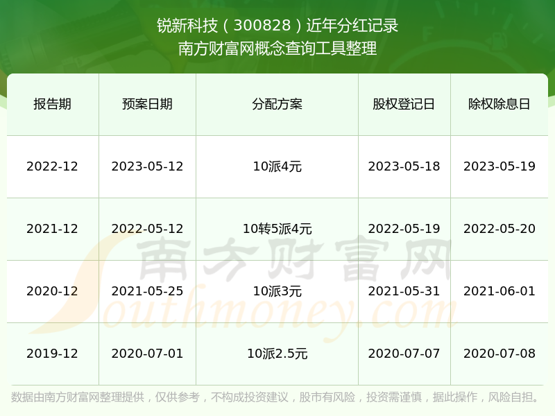 锐新科技最新一次公布的分红方案为10派4元。本次权益分派股权登记日为2023年5月18日,除权除息日为2023年5月19日,派息日为2023年5月19日。