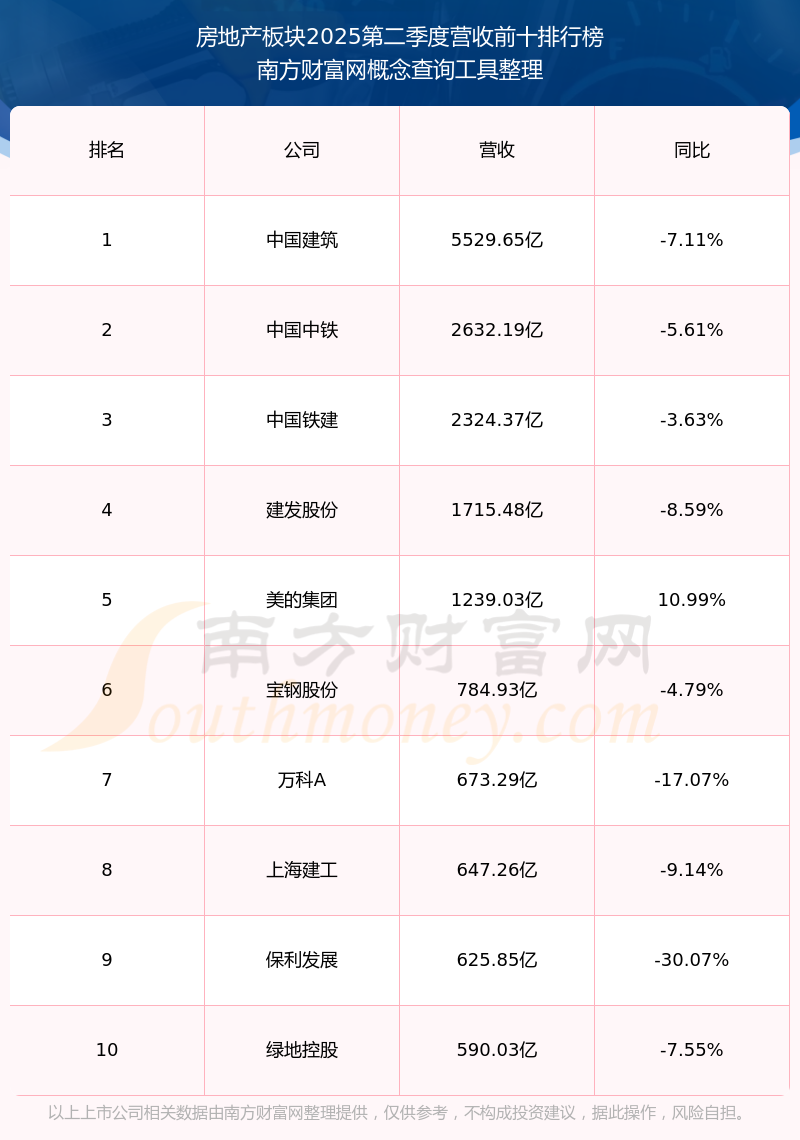 按照南方财富网概念查询工具统计,该股所属板块为房地产板块,该板块共有261只股票,华丽家族2025第二季度营收在该板块中排名为第242名,该板块2025第二季度营收排名前十的股票如下表: