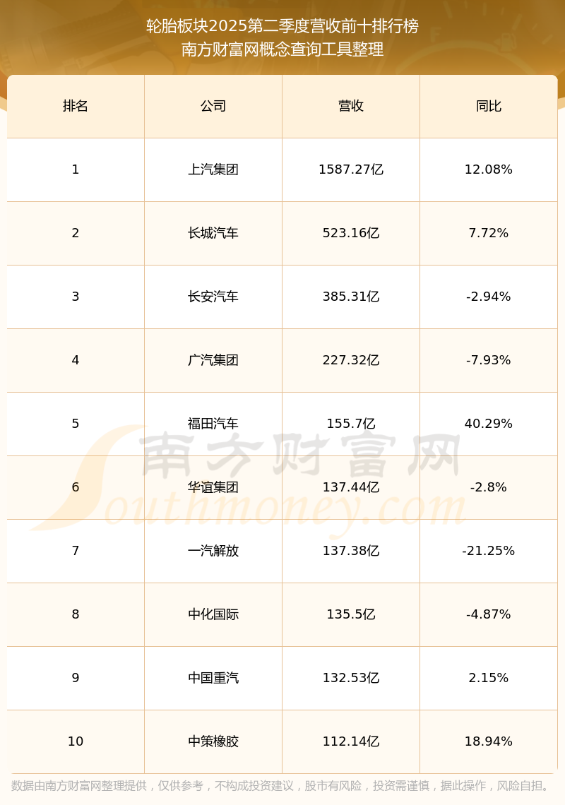 按照南方财富网概念查询工具统计,该股所属板块为轮胎板块,该板块共有58只股票,佳通轮胎2025第二季度营收在该板块中排名为第36名,该板块2025第二季度营收排名前十的股票如下表: