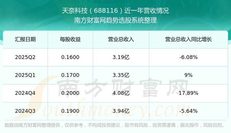 天奈科技发布2025年第二季度财报。实现总营收3.19亿元,同比增长-6.08%;扣非净利润同比增长-12.96%至5200.36万元。