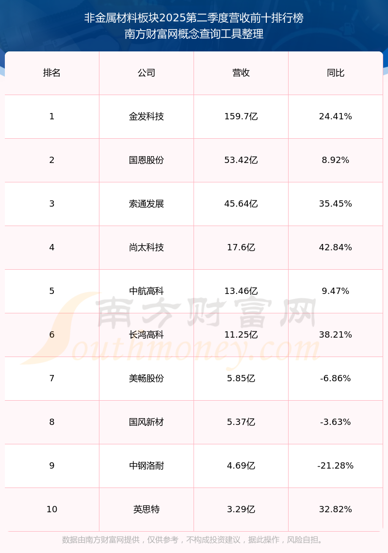 按照南方财富网概念查询工具统计,该股所属板块为非金属材料板块,该板块共有32只股票,鲁信创投2025第二季度营收在该板块中排名为第32名,该板块2025第二季度营收排名前十的股票如下表: