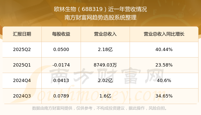 欧林生物发布2025年第二季度财报。实现总营收2.18亿元,同比增长40.44%;扣非净利润同比增长559.66%至1874.63万元。