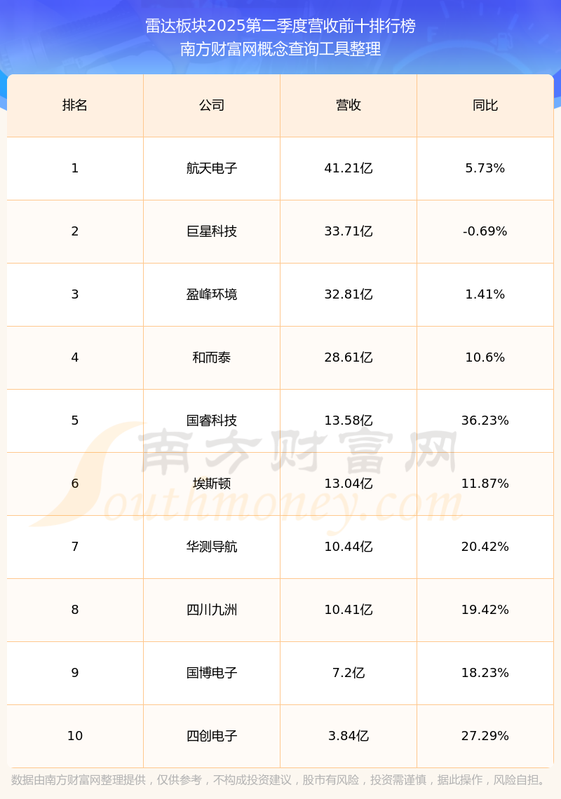 按照南方财富网概念查询工具统计,该股所属板块为雷达板块,该板块共有29只股票,四创电子2025第二季度营收在该板块中排名为第10名,该板块2025第二季度营收排名前十的股票如下表:
