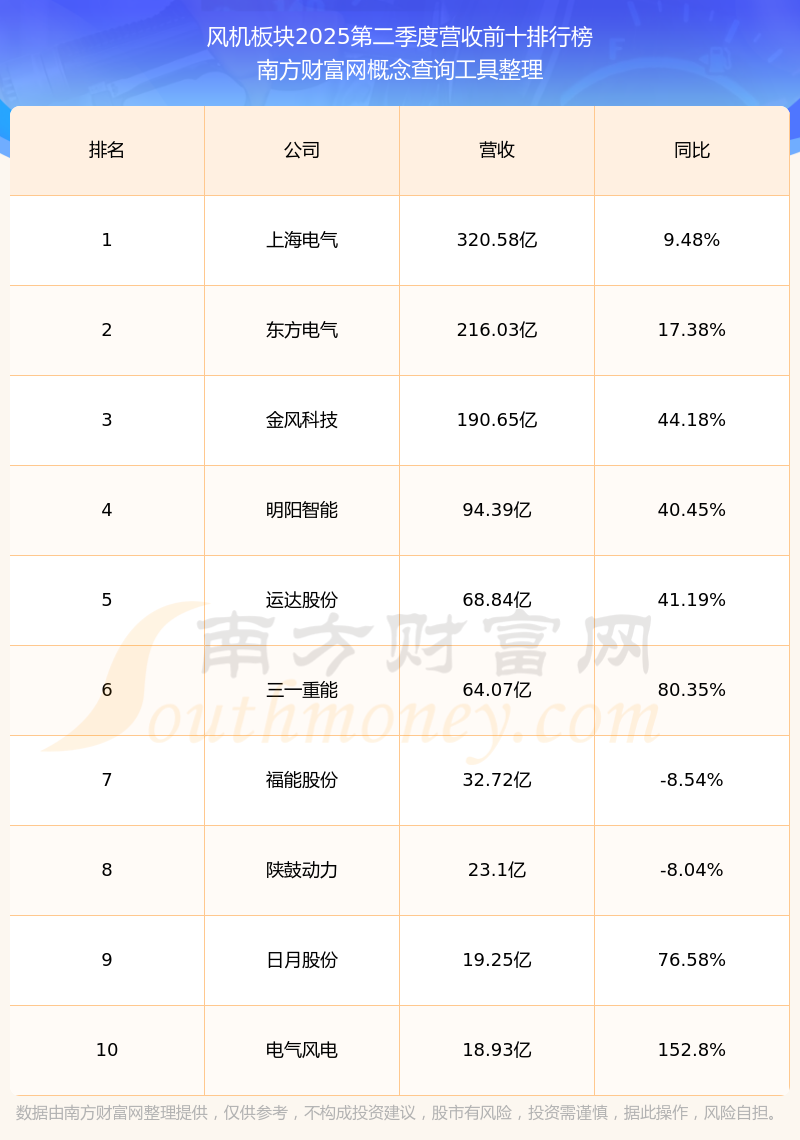 按照南方财富网概念查询工具统计,该股所属板块为风机板块,该板块共有27只股票,电气风电2025第二季度营收在该板块中排名为第10名,该板块2025第二季度营收排名前十的股票如下表: