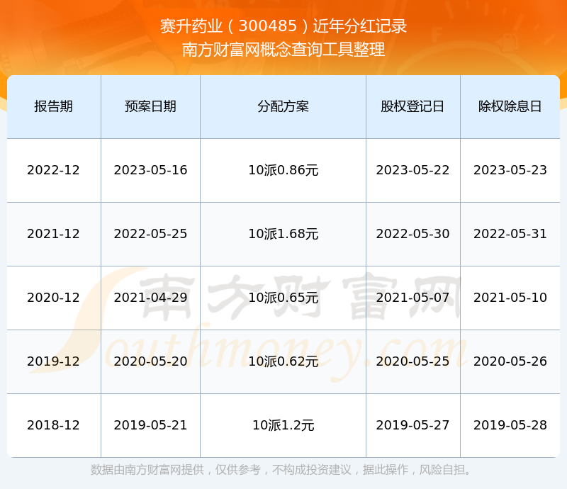 赛升药业最新一次公布的分红方案为10派0.86元。本次权益分派股权登记日为2023年5月22日,除权除息日为2023年5月23日,派息日为2023年5月23日。