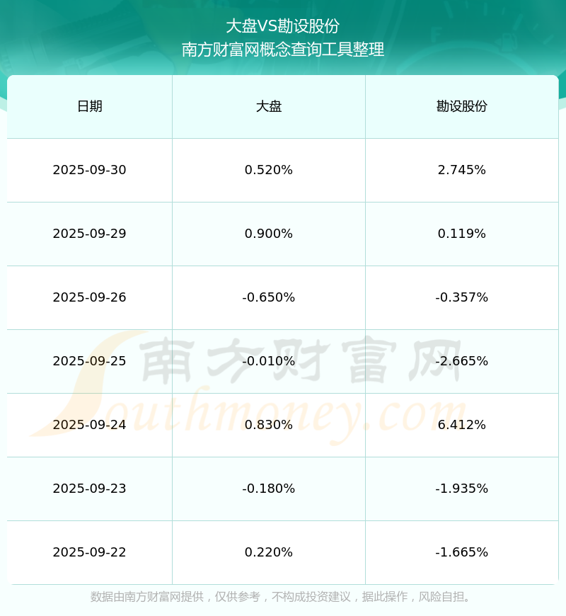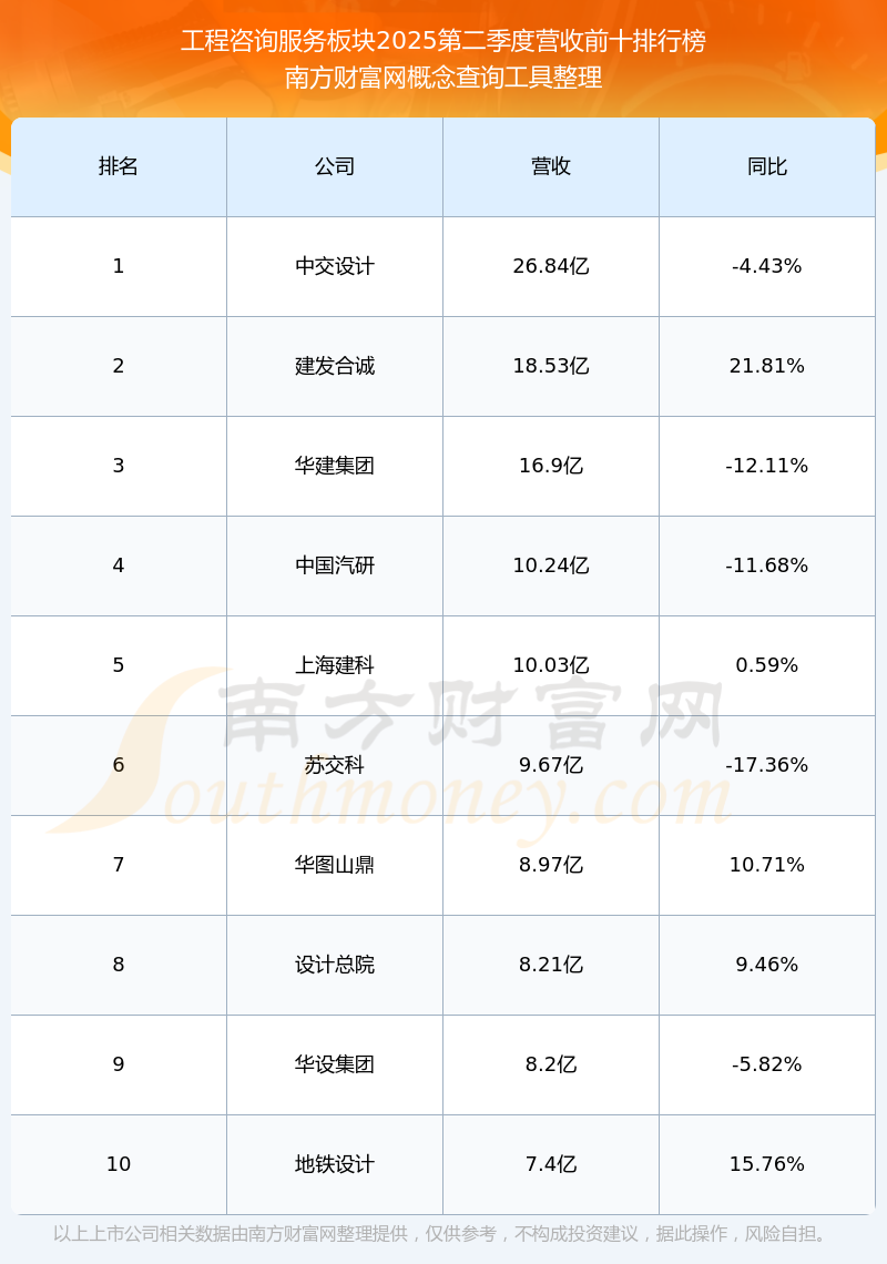 按照南方财富网概念查询工具统计,该股所属板块为工程咨询服务板块,该板块共有43只股票,勘设股份2025第二季度营收在该板块中排名为第17名,该板块2025第二季度营收排名前十的股票如下表:
