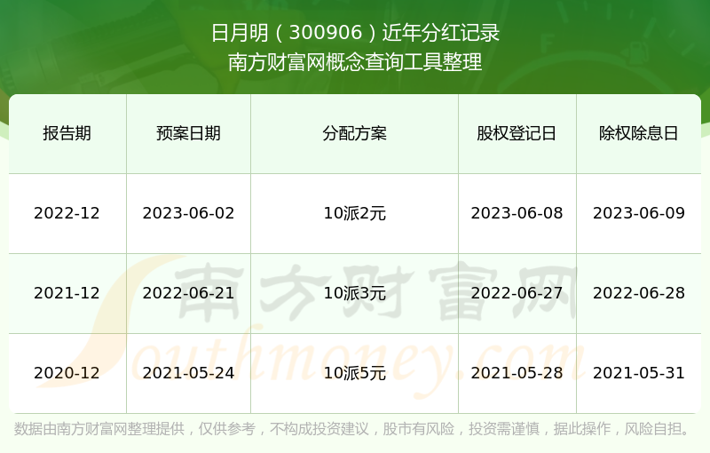 日月明最新一次公布的分红方案为10派2元。本次权益分派股权登记日为2023年6月8日,除权除息日为2023年6月9日,派息日为2023年6月9日。
