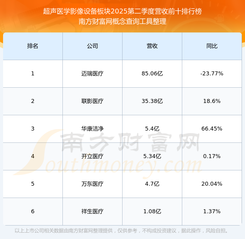 按照南方财富网概念查询工具统计,该股所属板块为超声医学影像设备板块,该板块共有6只股票,祥生医疗2025第二季度营收在该板块中排名为第6名,该板块2025第二季度营收排名前十的股票如下表: