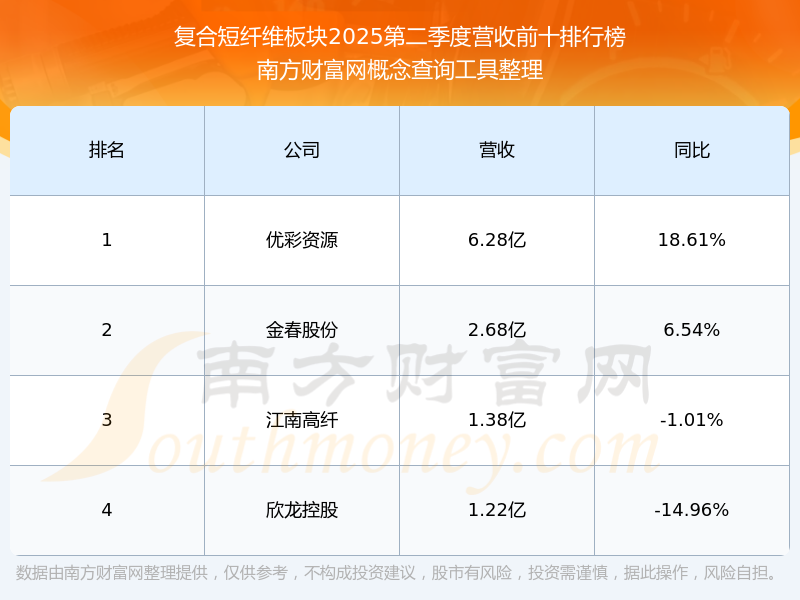 按照南方财富网概念查询工具统计,该股所属板块为复合短纤维板块,该板块共有4只股票,江南高纤2025第二季度营收在该板块中排名为第3名,该板块2025第二季度营收排名前十的股票如下表: