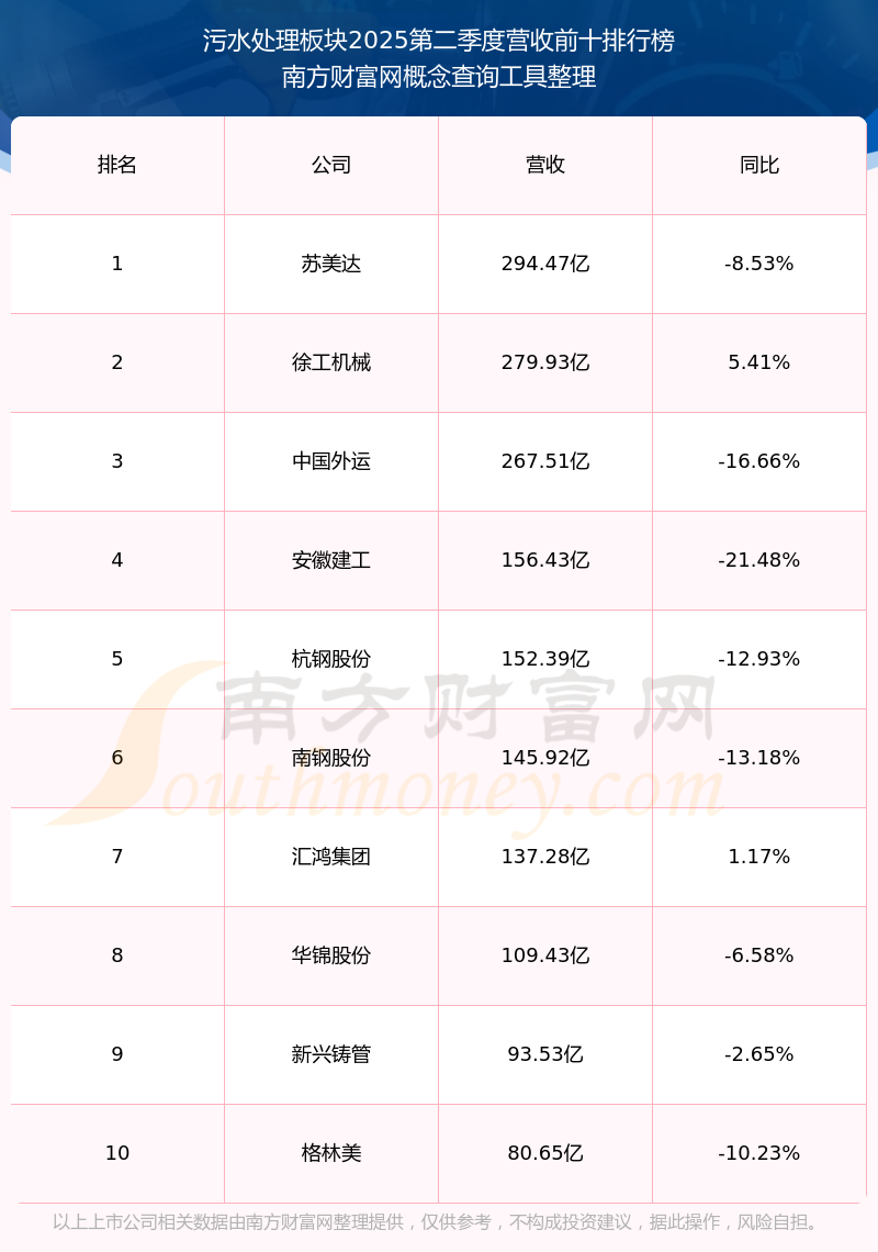 按照南方财富网概念查询工具统计,该股所属板块为污水处理板块,该板块共有202只股票,重庆水务2025第二季度营收在该板块中排名为第37名,该板块2025第二季度营收排名前十的股票如下表: