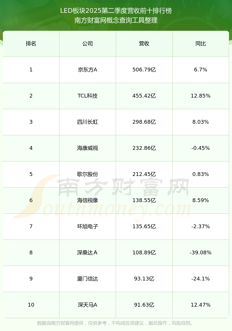 按照南方财富网概念查询工具统计,该股所属板块为LED板块,该板块共有168只股票,得邦照明2025第二季度营收在该板块中排名为第53名,该板块2025第二季度营收排名前十的股票如下表: