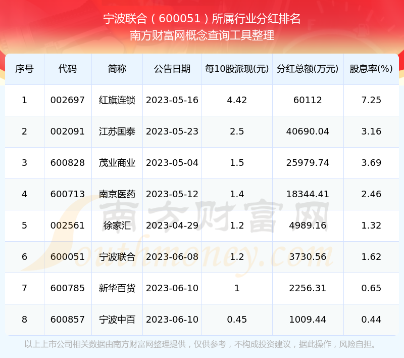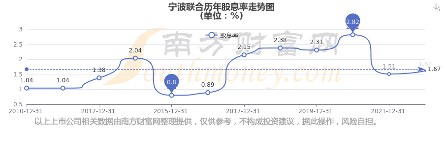 宁波联合最新一次公布的分红方案为10派1.2元。本次权益分派股权登记日为2023年6月15日,除权除息日为2023年6月16日,派息日为2023年6月16日。